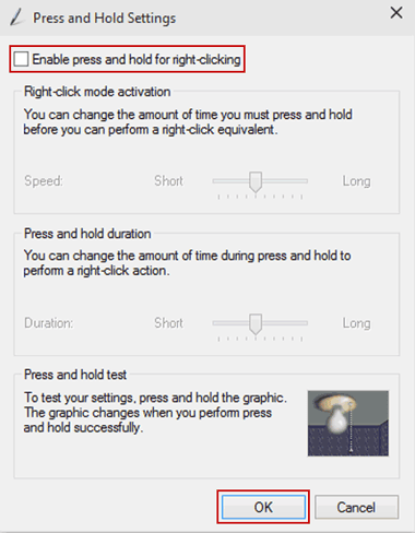 - Uncheck the box for "Enable press and hold for right-clicking," then click OK.